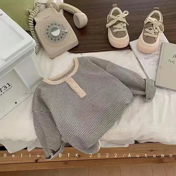 Keep your little one comfortable and stylish with this Kids’ Long Sleeve Striped T-Shirt, perfect for spring and autumn wear. Designed for both boys and girls, this simple yet fashionable top features a classic striped pattern inspired by Korean kids’ style. Made from soft, warm, and breathable fabric, it works perfectly as a bottoming shirt for layering or as a standalone everyday top for play, school, or outings.